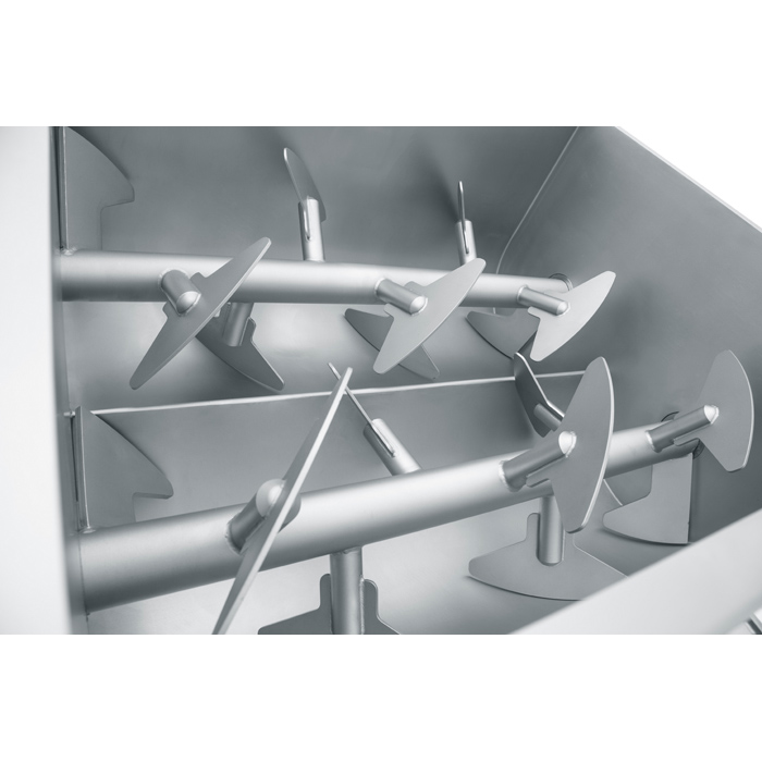 工作原理:采用雙軸橢圓比螺旋布置的扇形漿葉,對物料進行徑向攪拌,同時完成軸向回流,使物料以得充分混合均勻,達到理想的混合效果。